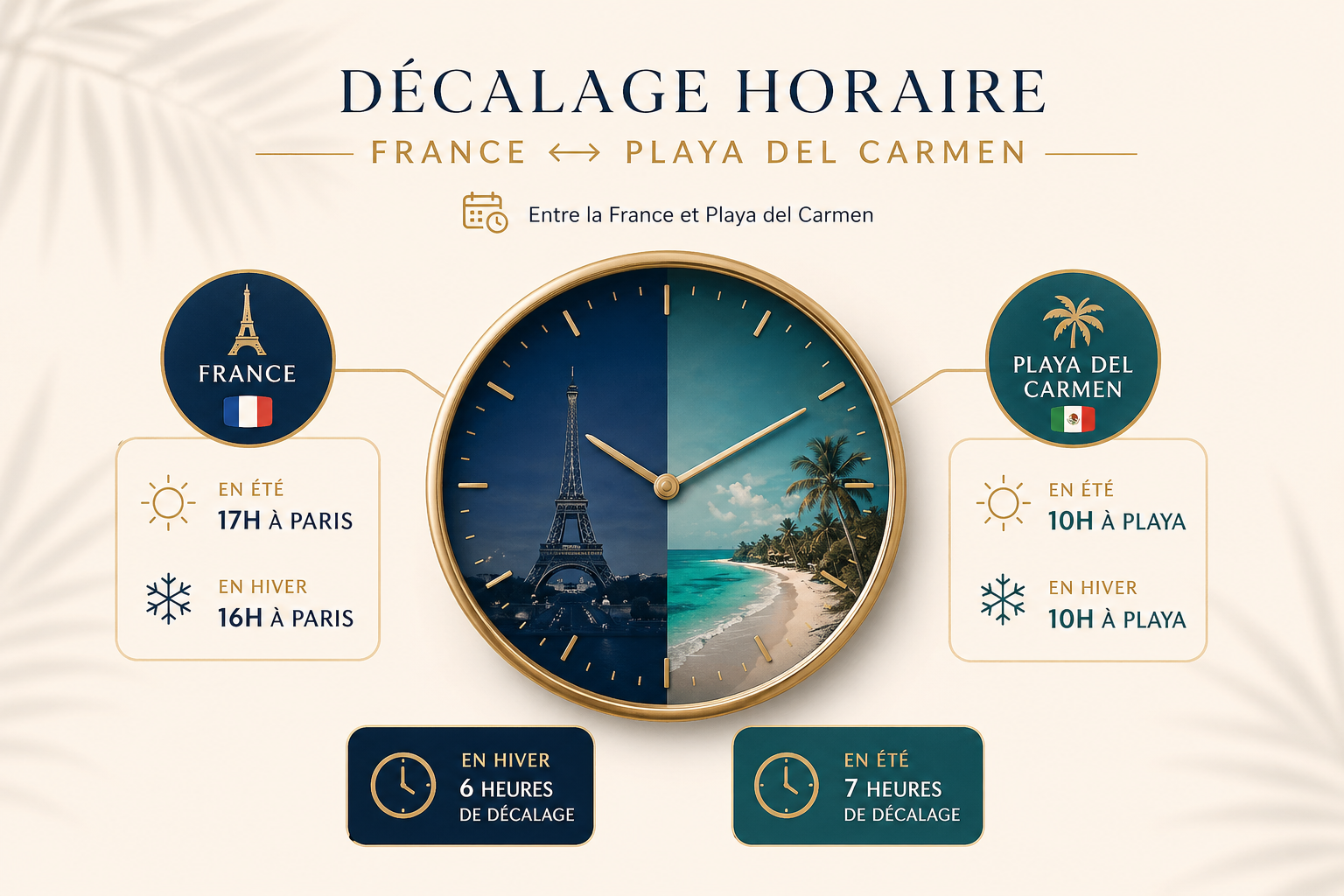 Entre la France et Playa del Carmen, le décalage horaire varie selon la période de l’année :